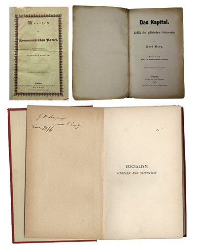 左上圖為1848年《共產黨宣言》德文第一版。右上圖為1867年《資本論》德文第1卷第一版。下圖為恩格斯的題字贈書《社會主義從空想到科學的發(fā)展》,1892年英文版。 中央黨史和文獻研究院供圖